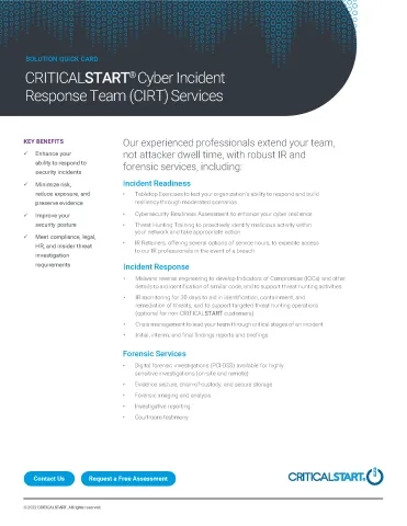 This solution quick card discusses the robust incident readiness, incident response and forensic services provided by our CIRT