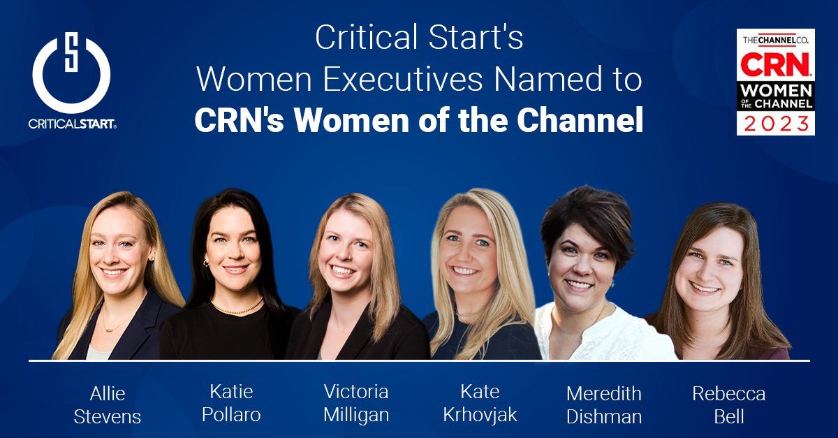 PLANO, TX, May 10, 2023 – Today, Critical Start, a leading provider of Managed Detection and Response (MDR) cybersecurity solutions, announced that six of its channel leaders have been named to CRN's Women of the Channel list for 2023: Meredith Dishman, director of distribution channels, Allie Stevens, senior director of channel and field marketing, Kate Krhovjak, channel and field marketing manager - Central, Victoria Milligan, channel and field marketing manager - East, Rebecca Bell, channel and field marketing manager - West, and Katie Pollaro, channel marketing manager.