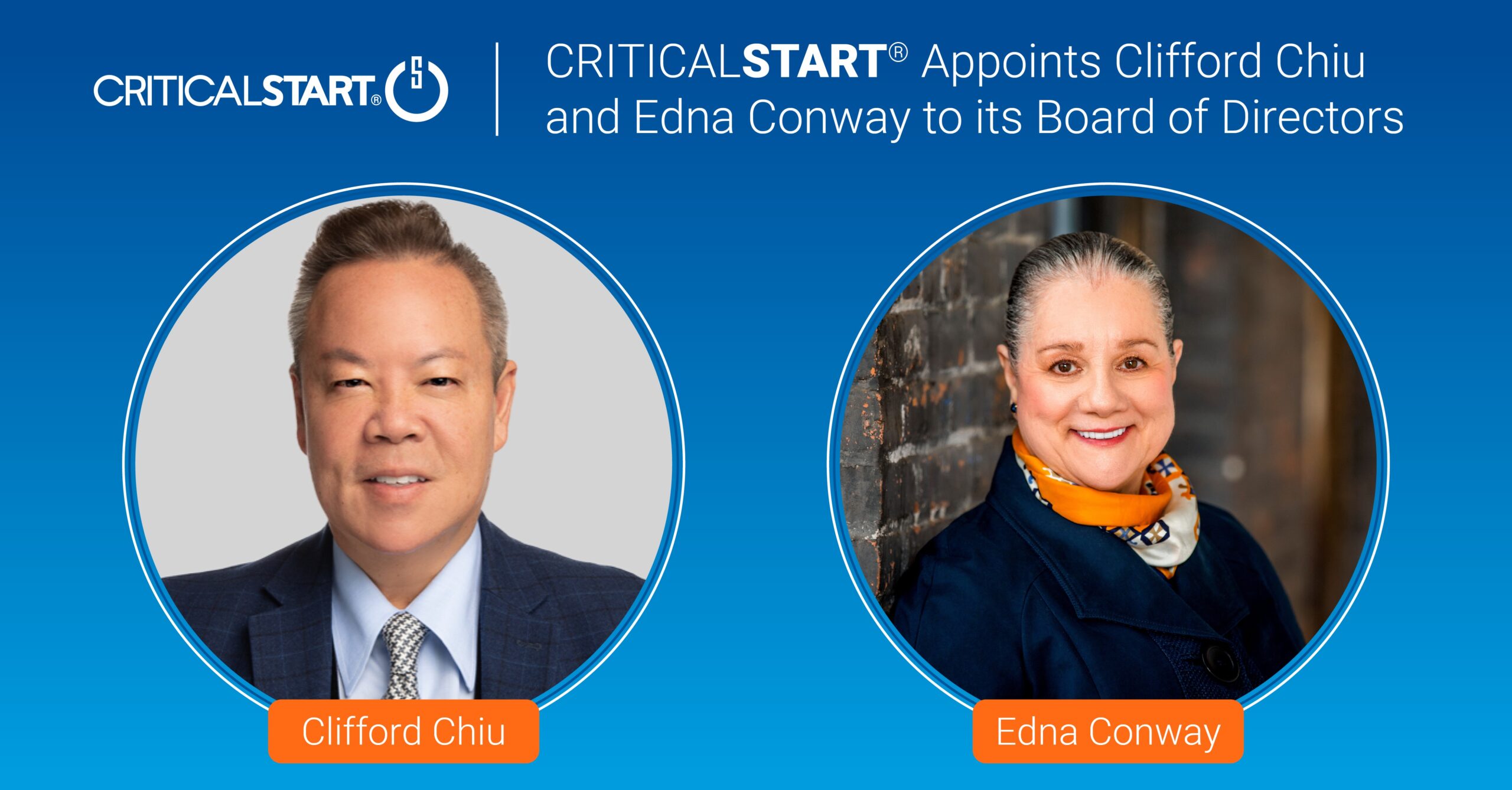 Plano, TX, July 11, 2023 - Critical Start, a leading provider of Managed Detection and Response (MDR) cybersecurity solutions, today announced the additions of Clifford Chiu and Edna Conway to its Board of Directors. Chiu and Conway’s extensive corporate and technical executive leadership experience will support Critical Start’s continued growth and commitment to reducing cyber risk and securing customers against cyber threats.