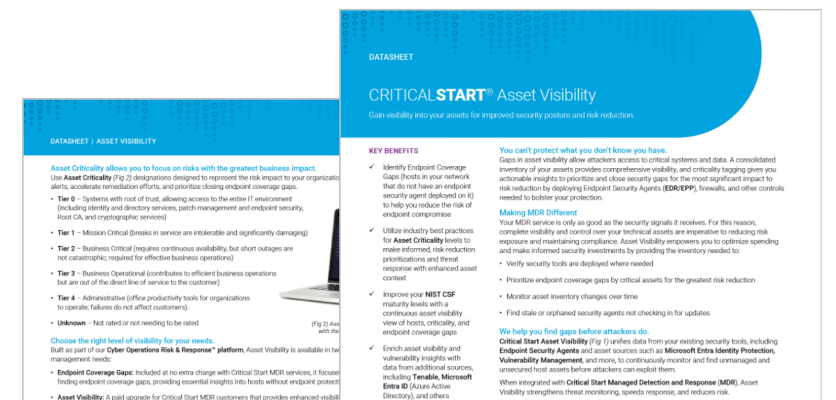 Critical Start Asset Visibility gives you a single source of truth for your asset inventory, uncovers assets that lack endpoint and vulnerability scanning protection, and helps you prioritize your mitigation of risk exposure so you can proactively reduce the risk of a breach.