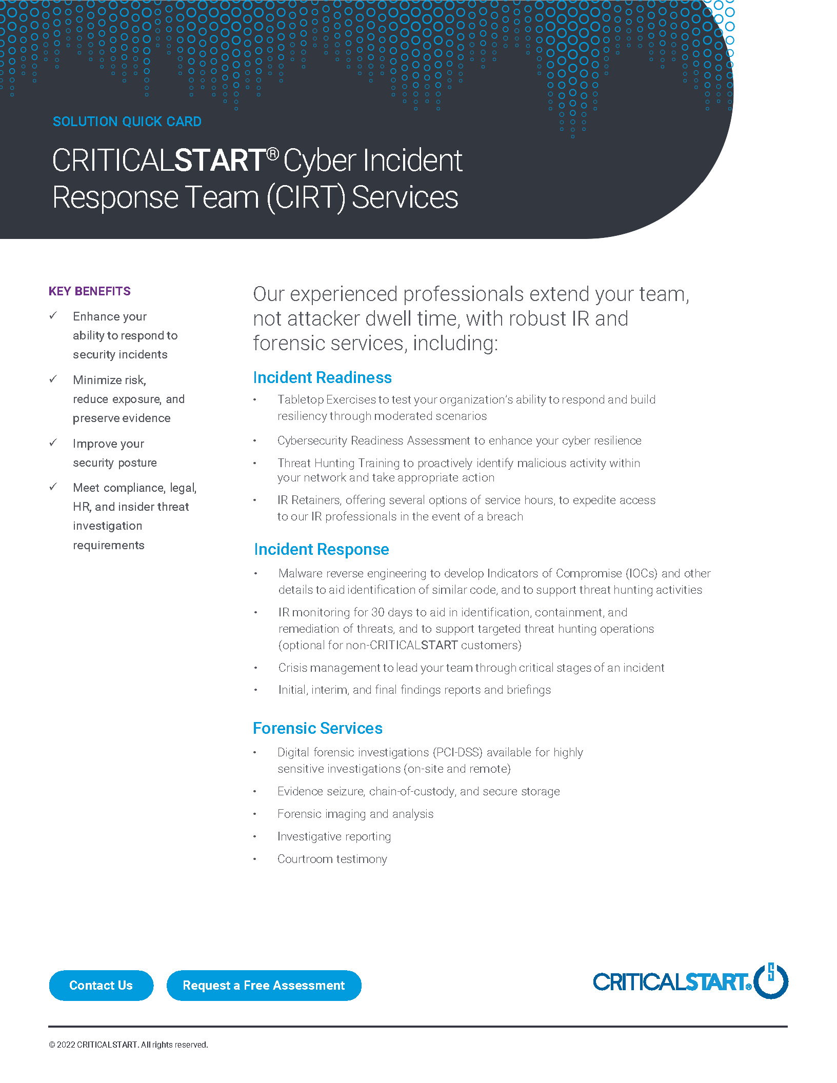 This solution quick card discusses the robust incident readiness, incident response and forensic services provided by our CIRT.